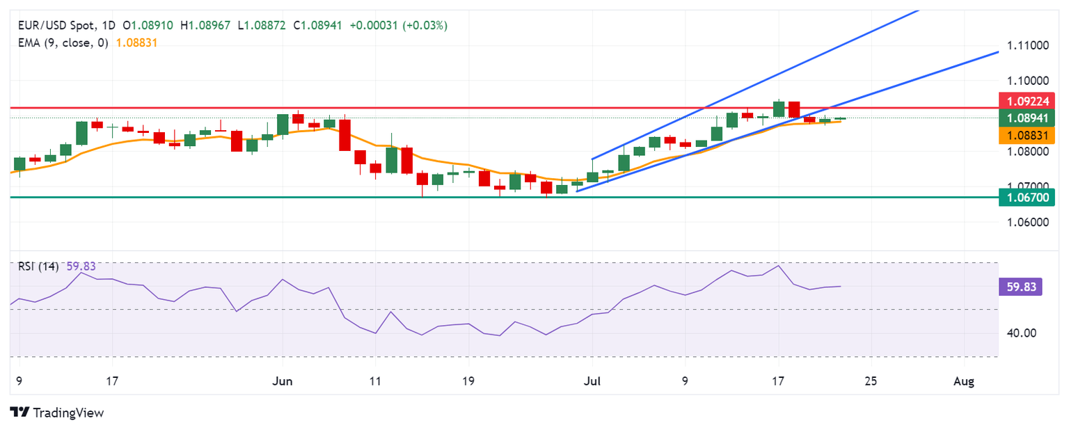 El EUR/USD avanza por segundo día consecutivo, cotizando alrededor de 1.0900 durante la sesión asiática del martes. El análisis del gráfico diario muestra un debilitamiento de una tendencia alcista, ya que el par se posiciona por debajo de un canal ascendente.