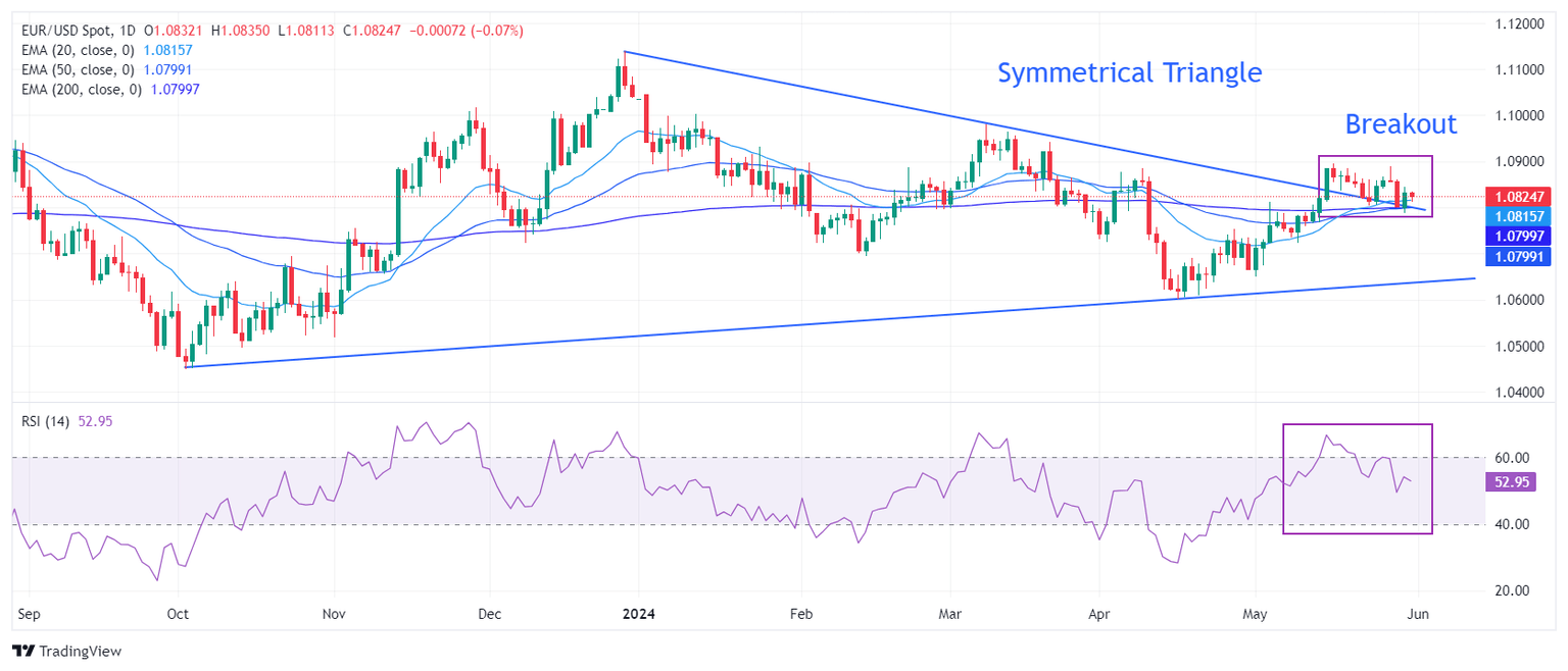 El EUR/USD sube a 1.0880 después de los datos suaves de la inflación subyacente mensual del PCE de EE.UU. El EUR/USD mantiene la ruptura del patrón gráfico de triángulo simétrico formado en un marco de tiempo diario, que está en la región de 1.0800. La perspectiva a corto plazo del par de divisas compartido sigue siendo incierta ya que lucha por mantenerse por encima de todas las EMAs de corto a largo plazo.
