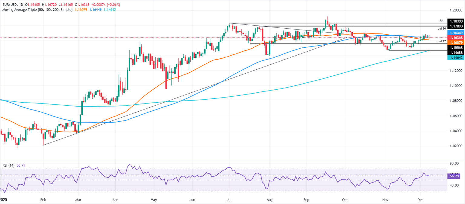 El EUR/USD se desliza un 0,05% al comenzar la semana, gracias a la fortaleza general del Dólar estadounidense, en medio de un comercio agitado mientras los operadores se preparan para la decisión de política monetaria de la Reserva Federal. Al momento de escribir, el par se negocia a 1.1637 después de alcanzar un máximo diario de 1.1672.