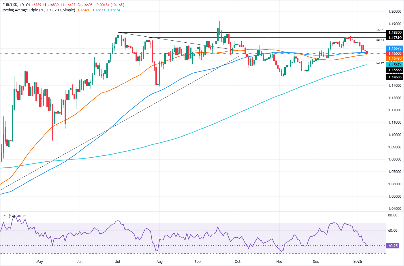 EUR/USD cae por cuarto día consecutivo el jueves, ya que los datos económicos de empleo superaron las expectativas. Los datos en la Eurozona reafirmaron a los operadores que el ciclo de alivio del Banco Central Europeo terminó, ya que los precios de producción en la zona se desinflaron en diciembre. En el momento de escribir, el par se cotiza a 1.1652, bajando un 0.19%.