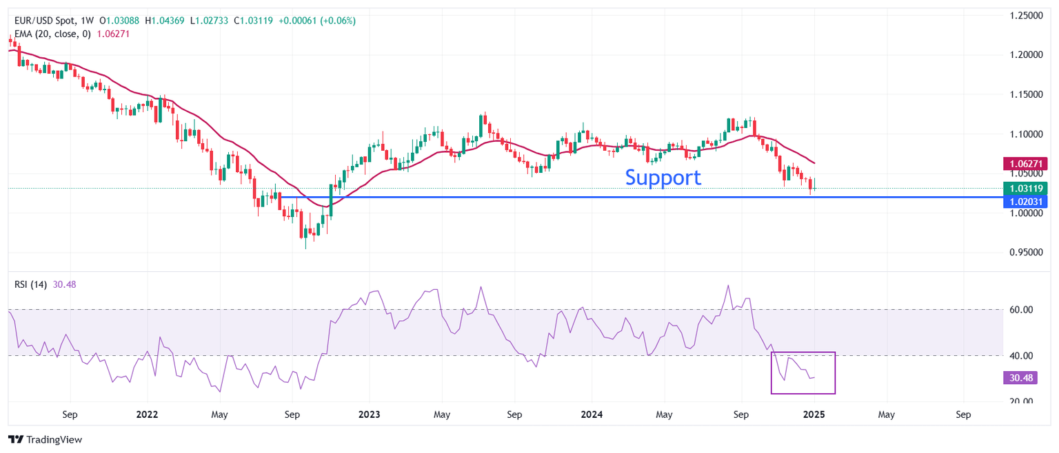 El EUR/USD cotiza cerca del soporte clave trazado desde el máximo de septiembre de 2022 de 1.0200 en un marco de tiempo semanal. La perspectiva del par de divisas principal es ampliamente bajista ya que la media móvil exponencial (EMA) de 20 semanas en 1.0627 está en declive.