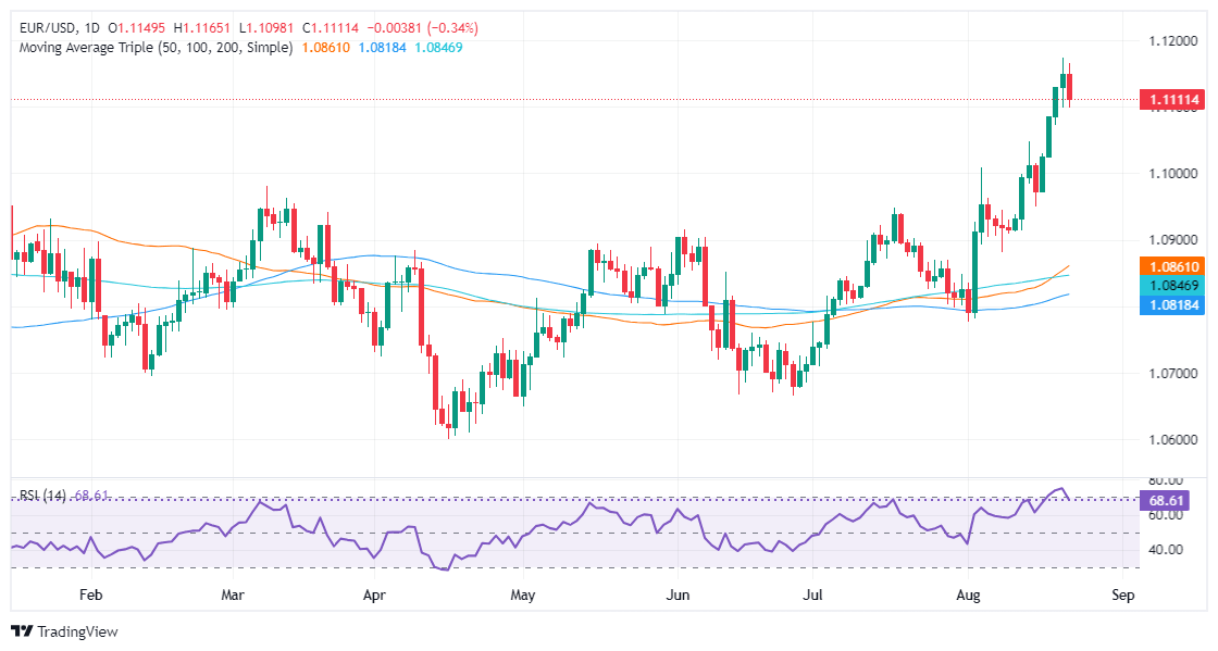 El EUR/USD está listo para terminar la sesión del jueves con pérdidas de más del 0,30% después de que el Dólar se viera reforzado por los altos rendimientos del Tesoro de EE.UU., a pesar de que los funcionarios de la Fed apoyan un recorte de tasas en la próxima reunión de septiembre. Al momento de escribir, el par se mantiene alrededor de la cifra de 1.1100 por tercer día consecutivo.
