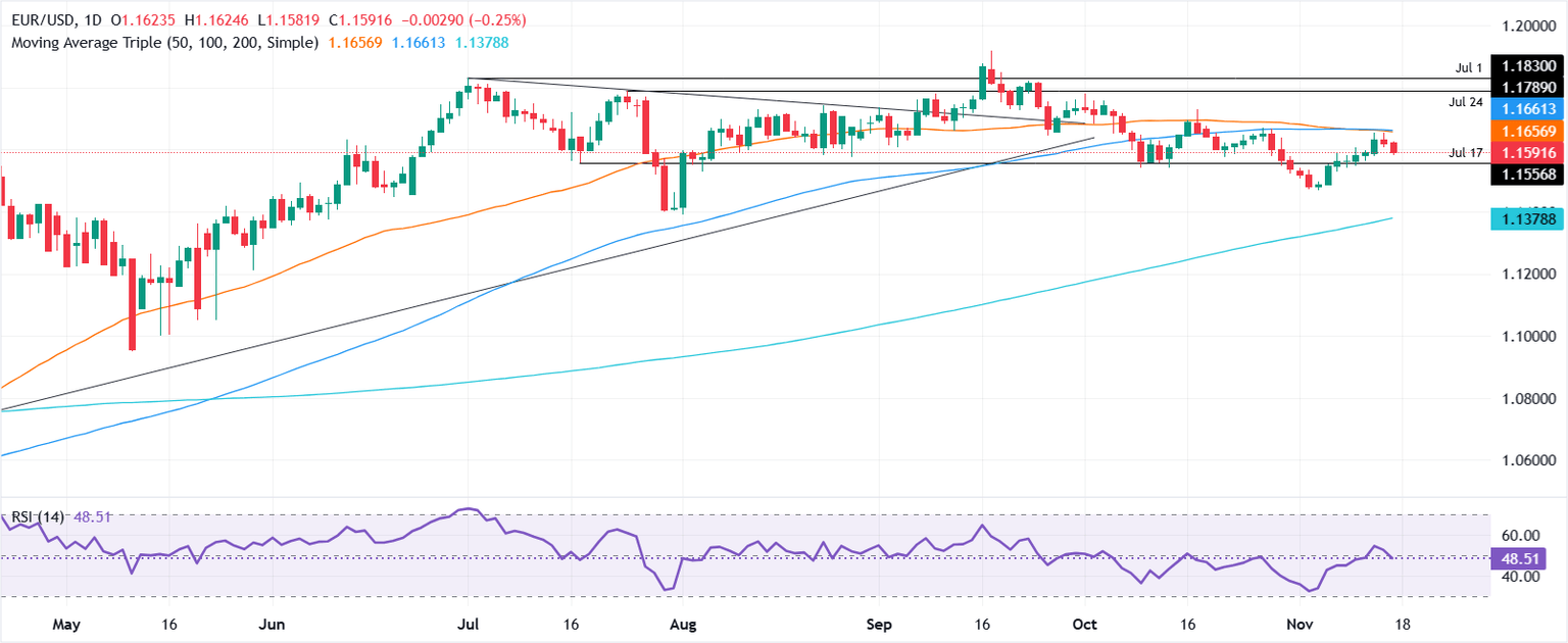 - EUR/USD retrocede a 1.1589 mientras los traders compran Dólar ante las expectativas de que la Fed mantenga las tasas sin cambios en diciembre.