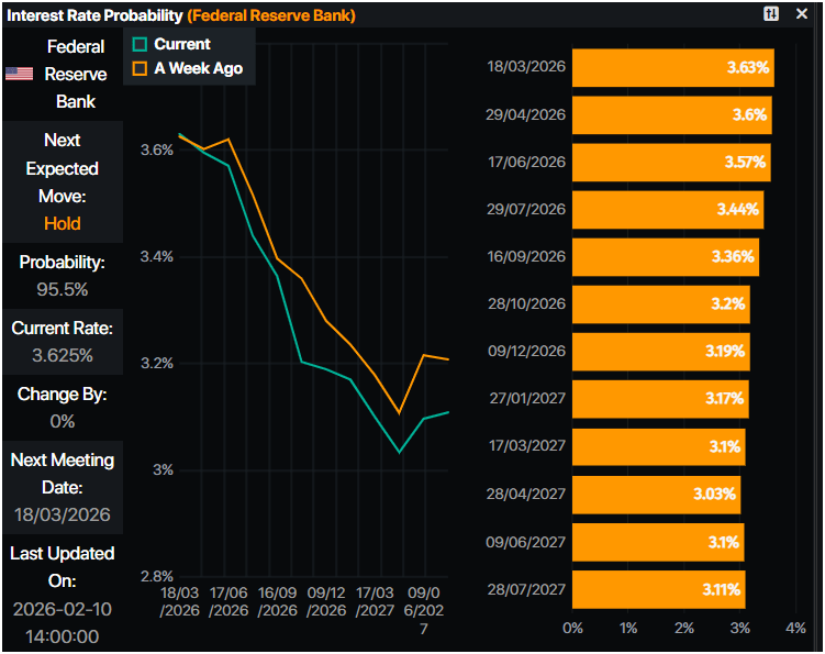 Aparte de esta divergencia entre la Fed y el BCE, favorece un mayor alza del EUR/USD. Los datos de Prime Market Terminal muestran que los mercados monetarios habían descontado casi 60 puntos básicos de recortes de tasas de la Reserva Federal. Por el contrario, se proyecta que el BCE mantenga las tasas sin cambios durante todo el año, con el primer movimiento esperado siendo un aumento de tasas.