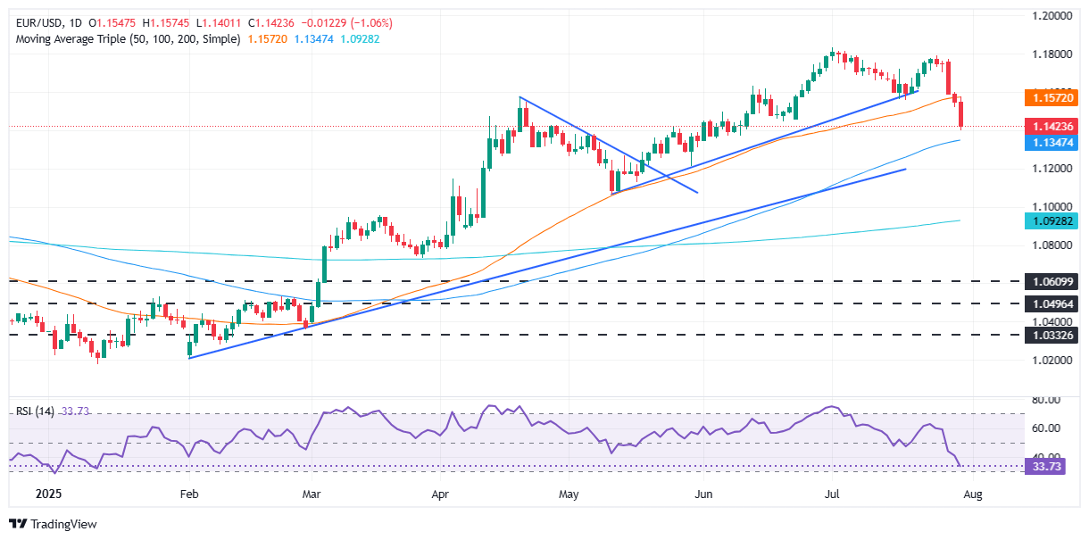 El EUR/USD cayó por debajo de 1.1500, extendiendo sus pérdidas hacia 1.1400 cerca de la media móvil simple (SMA) de 100 días de 1.1355. El Índice de Fuerza Relativa (RSI) muestra que los vendedores están a cargo, tras caer de alrededor de 40 a 34.60. Esto sugiere que se prevén más caídas en el par.
