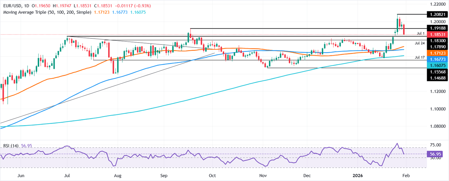 La imagen técnica del EUR/USD muestra que la tendencia alcista está en riesgo tras romper el máximo anual de 2025 de 1.1918, exacerbando una caída por debajo de 1.1850. El Índice de Fuerza Relativa (RSI) mostró que el impulso se volvió ligeramente bajista, lo que podría allanar el camino para más caídas en el par.