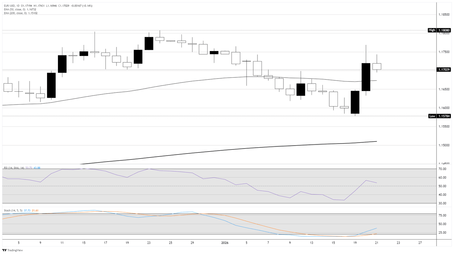 El EUR/USD se disparó fuertemente al inicio de la semana, ganando aproximadamente un 1.16 por ciento entre el lunes y el martes, antes de ceder alrededor de un 0.2 por ciento el miércoles, según la estructura de velas diarias de la semana actual. El retroceso a mitad de semana parece correctivo en lugar de cambiar la tendencia, con el par consolidándose cerca de los máximos recientes en lugar de retroceder la mayor parte de las ganancias anteriores.