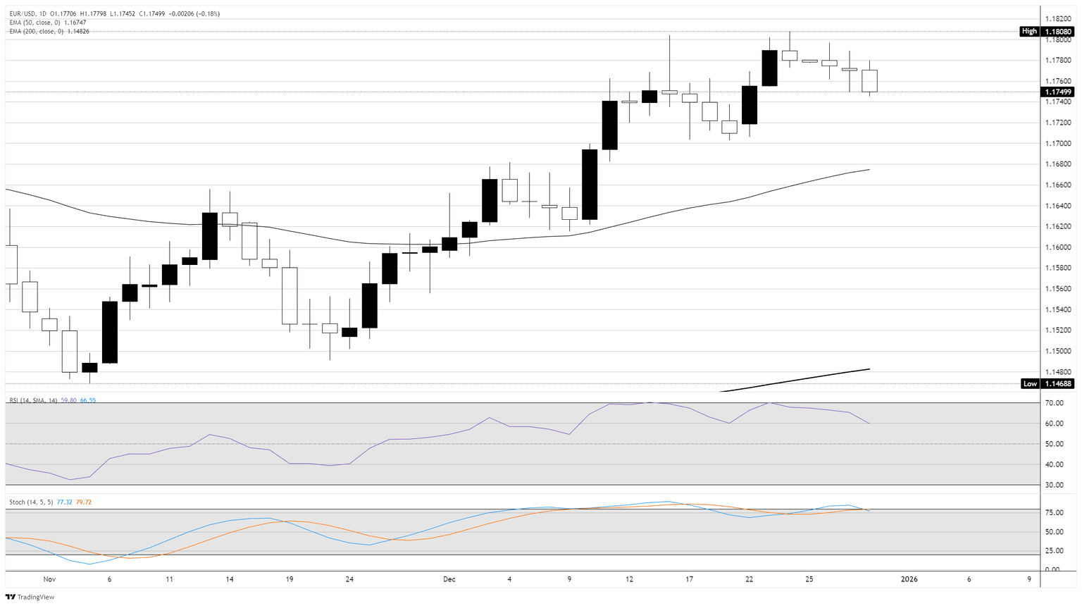 En el gráfico diario, el EUR/USD se cotiza a 1.1752. El precio se mantiene por encima de la EMA de 50 en 1.1675 y la EMA de 200 en 1.1393, manteniendo intacto un sesgo alcista. La EMA de 50 sube y se mantiene por encima de la EMA de 200, reforzando el soporte de tendencia. El RSI en 60.22 se mantiene alcista y por debajo de sobrecompra. El soporte inicial se sitúa en la EMA de 50, mientras que la EMA de 200 respalda el avance más amplio.