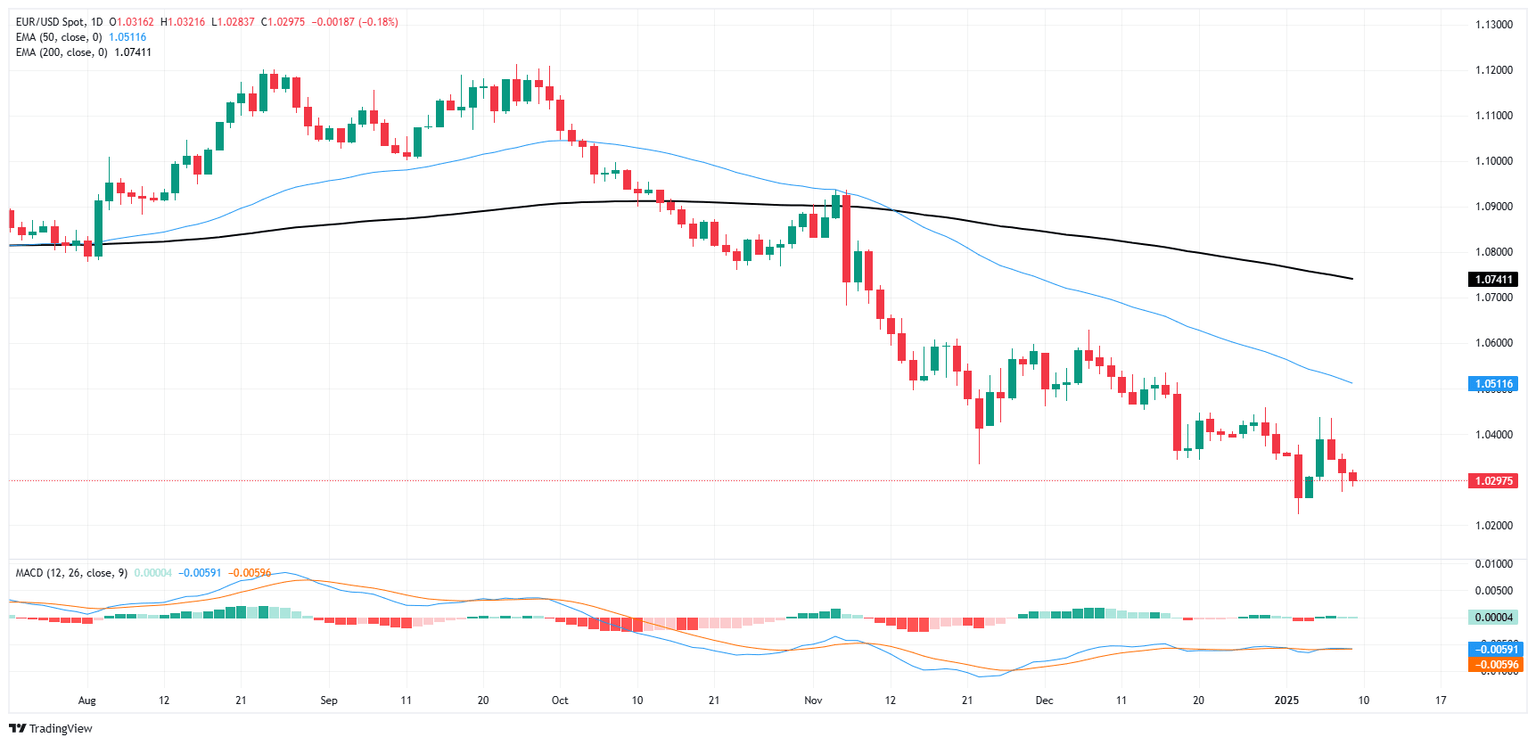 Enero acaba de comenzar, pero el Euro ya está en camino de cerrar un cuarto mes consecutivo en rojo mientras el par inicia el nuevo año de negociación con una nueva caída bajista hacia sus ofertas más bajas en más de dos años. El Euro ha caído bruscamente frente al Dólar estadounidense desde un rechazo bajista de la media móvil exponencial (EMA) de 200 días cerca de la región de 1.0900 en noviembre. El EUR/USD cayó un poco más del 6.5% desde el máximo al mínimo, y los alcistas del Euro están luchando por encontrar un nuevo punto de apoyo.