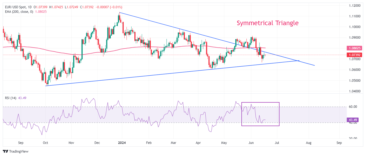 El EUR/USD cotiza cerca de la resistencia inmediata de 1.0750. El borde descendente de la formación de triángulo simétrico en un marco de tiempo diario, trazado desde el 28 de diciembre de 2023 en 1.1140, está actuando como una barrera importante para los alcistas del Euro.