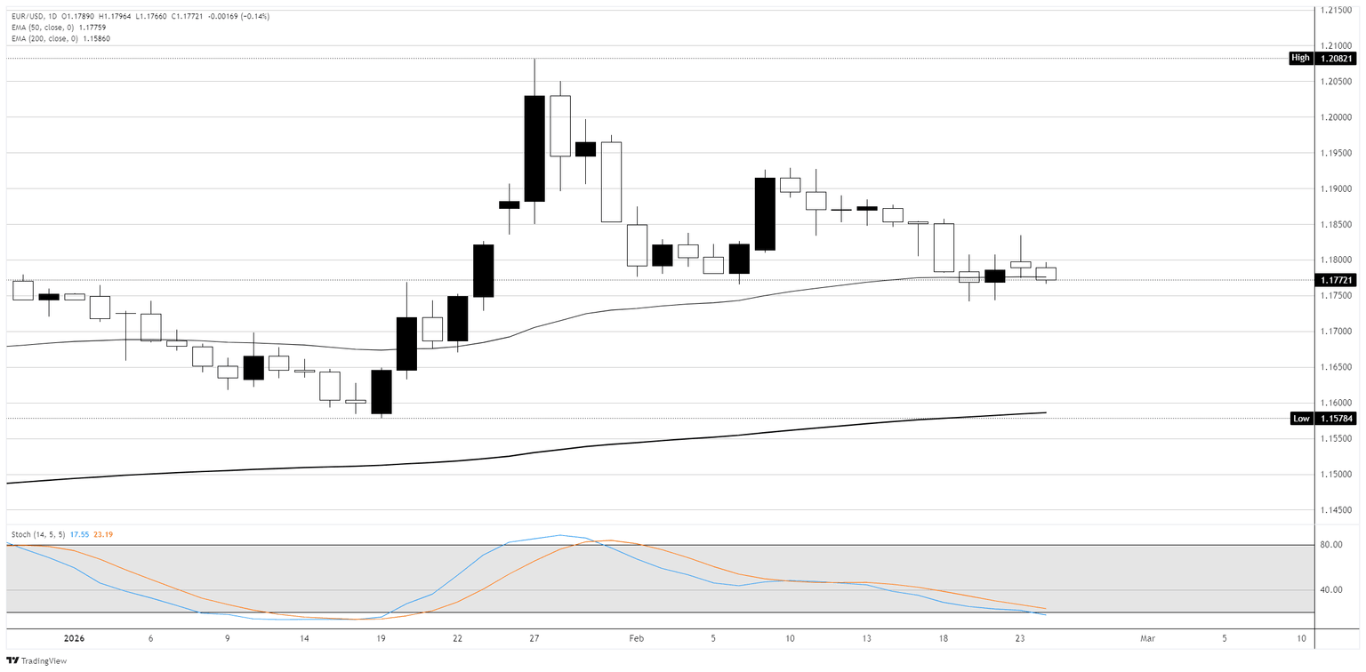 En el gráfico diario, el EUR/USD baja un 0.12% el martes, asentándose cerca de la media móvil exponencial (EMA) de 50 días cerca de 1.1775 tras una sesión de trading europea moderada. El par se ha retirado de manera constante desde el máximo de enero cerca de 1.2080, cediendo aproximadamente 300 pips a lo largo de un mes de declive definido por una secuencia de máximos y mínimos más bajos. El precio se mantiene bien por encima de la EMA de 200 días en 1.1585, que continúa confirmando la estructura alcista más amplia desde el mínimo de oscilación a principios de enero cerca de 1.1580. El oscilador estocástico ha cruzado a la baja y se está acercando a la zona de sobreventa, sugiriendo que el impulso a la baja puede estar cerca del agotamiento. Un grupo de velas de cuerpo pequeño en las sesiones recientes cerca de la EMA de 50 apunta a la indecisión en este nivel. El soporte inmediato se sitúa en el área de 1.1750, con el nivel psicológico de 1.1700 por debajo; una ruptura sostenida a la baja expondría el mínimo de oscilación de 1.1578. Un rebote desde la EMA de 50 y la recuperación de 1.1830 serían necesarios para cambiar la tendencia a corto plazo de nuevo hacia la zona de resistencia de 1.1900 a 1.1950.