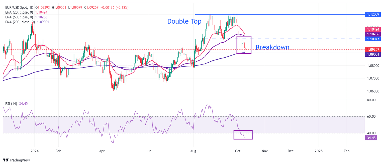 El EUR/USD extiende su caída cerca de 1.0900 después de no mantener el soporte clave de 1.0950. El par de divisas principal se debilitó después de que se produjera una ruptura del patrón gráfico de Doble Techo en un marco temporal diario. El patrón gráfico mencionado se desencadenó después de que el par rompiera por debajo del mínimo del 11 de septiembre de 1.1000.