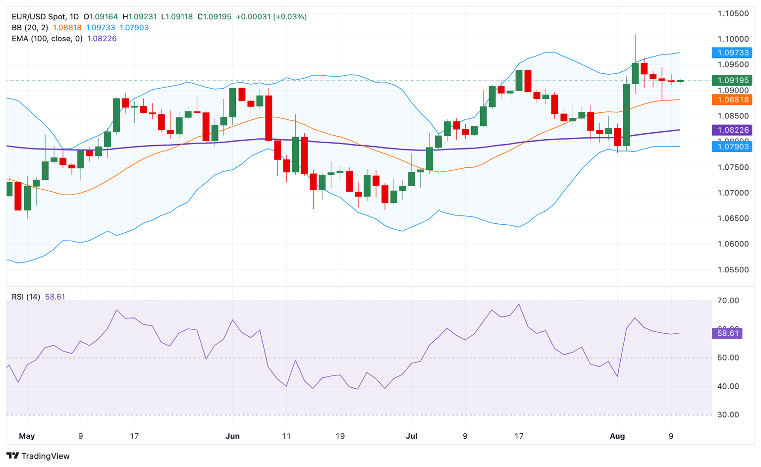 El par EUR/USD cotiza con leves ganancias alrededor de 1.0920 al inicio de la sesión europea del lunes. El repunte del par principal está respaldado por la consolidación del Dólar estadounidense (USD). Los inversores esperan la encuesta ZEW de agosto de Alemania el martes para obtener un nuevo impulso.