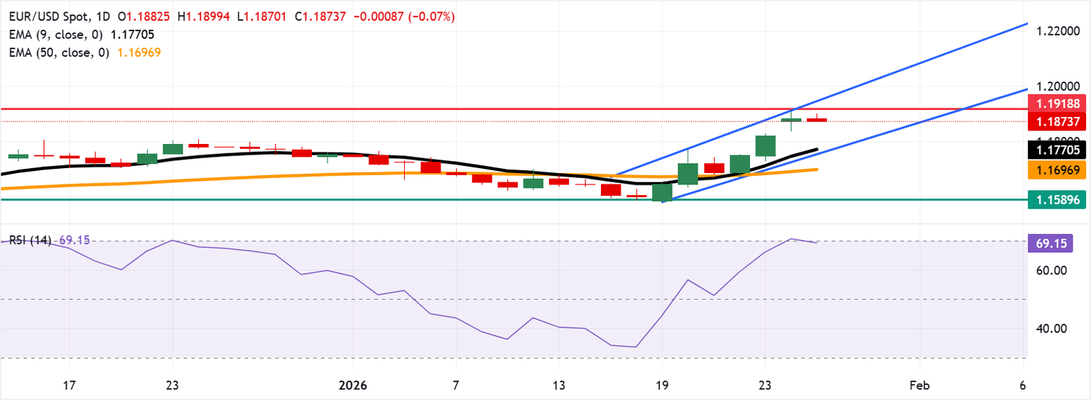 El EUR/USD retrocede tras tres días de ganancias, cotizando alrededor de 1.1870 durante las horas asiáticas del martes. El análisis técnico del gráfico diario muestra que el par se eleva dentro del patrón de canal ascendente, sugiriendo un sesgo alcista en curso.