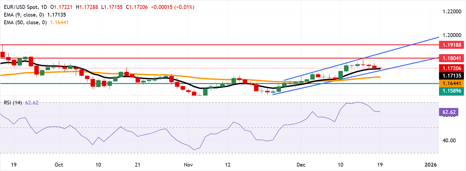 El EUR/USD se mantiene más débil por cuarta sesión consecutiva, cotizando alrededor de 1.1720 durante las horas asiáticas del viernes. En el gráfico diario, el análisis técnico indica un sesgo alcista predominante, ya que el par se mantiene dentro del patrón de canal ascendente. Además, el Índice de Fuerza Relativa (RSI) de 14 días se sitúa en 62.11, señalando un firme impulso positivo sin presión de sobrecompra.