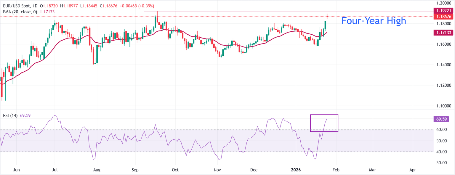 EUR/USD Pronóstico del Precio: Salta a cerca de un máximo de cuatro años en 1.1920