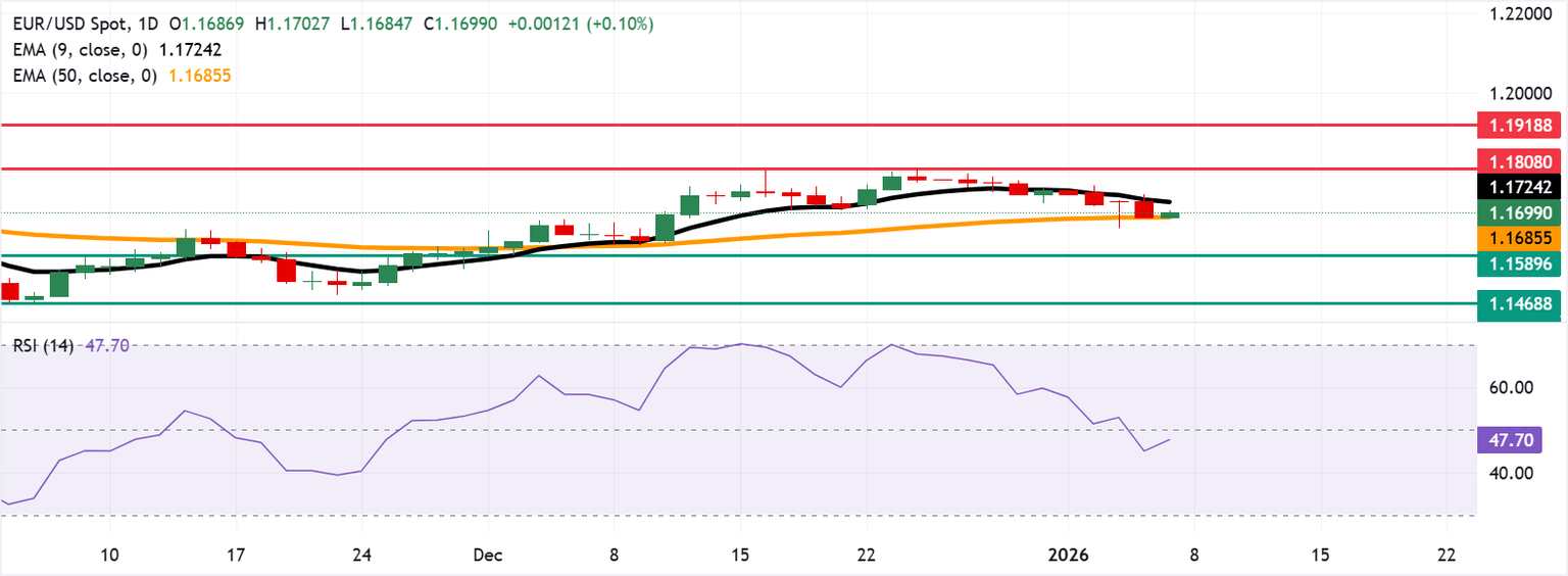 EUR/USD Pronóstico del Precio: Operando alrededor de 1.1700 tras rebotar desde la EMA de 50 días