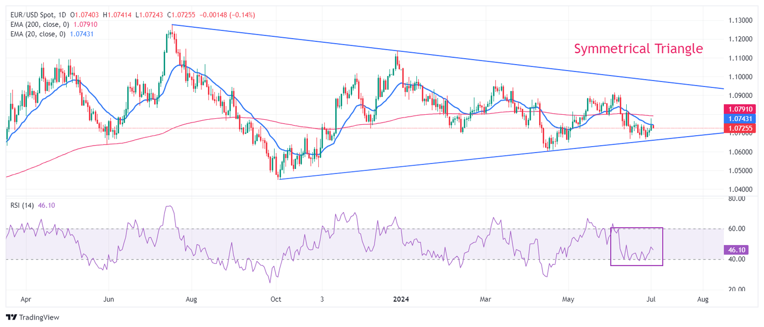 El EUR/USD cae cerca de 1.0720 después de no poder mantenerse por encima de la media móvil exponencial (EMA) de 20 días, que opera alrededor de 1.0740. El par EUR/USD rebotó la semana pasada después de encontrar un fuerte interés comprador cerca del borde ascendente de la formación de triángulo simétrico en un marco de tiempo diario cerca de 1.0666, que se marca desde el mínimo del 3 de octubre de 2023 en 1.0448. El borde descendente del patrón de gráfico mencionado se traza desde el máximo del 18 de julio de 2023 en 1.1276. La formación de triángulo simétrico exhibe una fuerte contracción de la volatilidad, lo que indica bajo volumen y ticks estrechos.