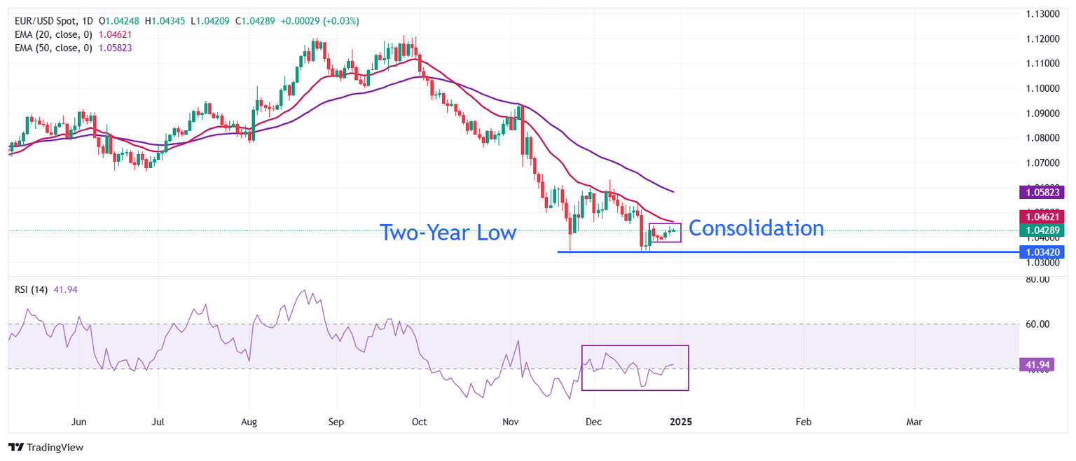 El EUR/USD se consolida en un rango estrecho desde el lunes por encima del mínimo de dos años de 1.0335. La perspectiva del par de divisas principal sigue siendo bajista ya que las medias móviles exponenciales (EMAs) de 20 y 50 días en 1.0464 y 1.0588, respectivamente, están en declive.