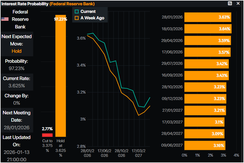 El mercado monetario ha recortado las probabilidades de un recorte de tasas de 25 puntos básicos por parte de la Fed, reveló la herramienta de Probabilidad de Tasa de Interés de Prime Market Terminal. Los operadores ven la tasa de fondos de la Fed terminando en 3.23% hasta ahora, lo que implica 52 puntos básicos de recortes.