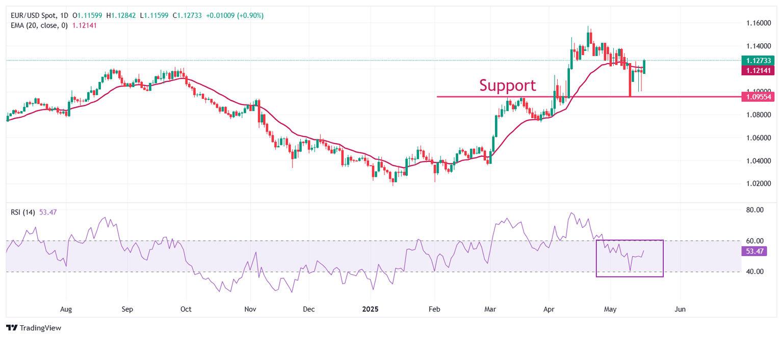 El EUR/USD se recupera cerca de 1.1270 al inicio de la semana. La perspectiva a corto plazo del par se ha vuelto alcista ya que logra mantener la media móvil exponencial (EMA) de 20 días, que está alrededor de 1.1214.