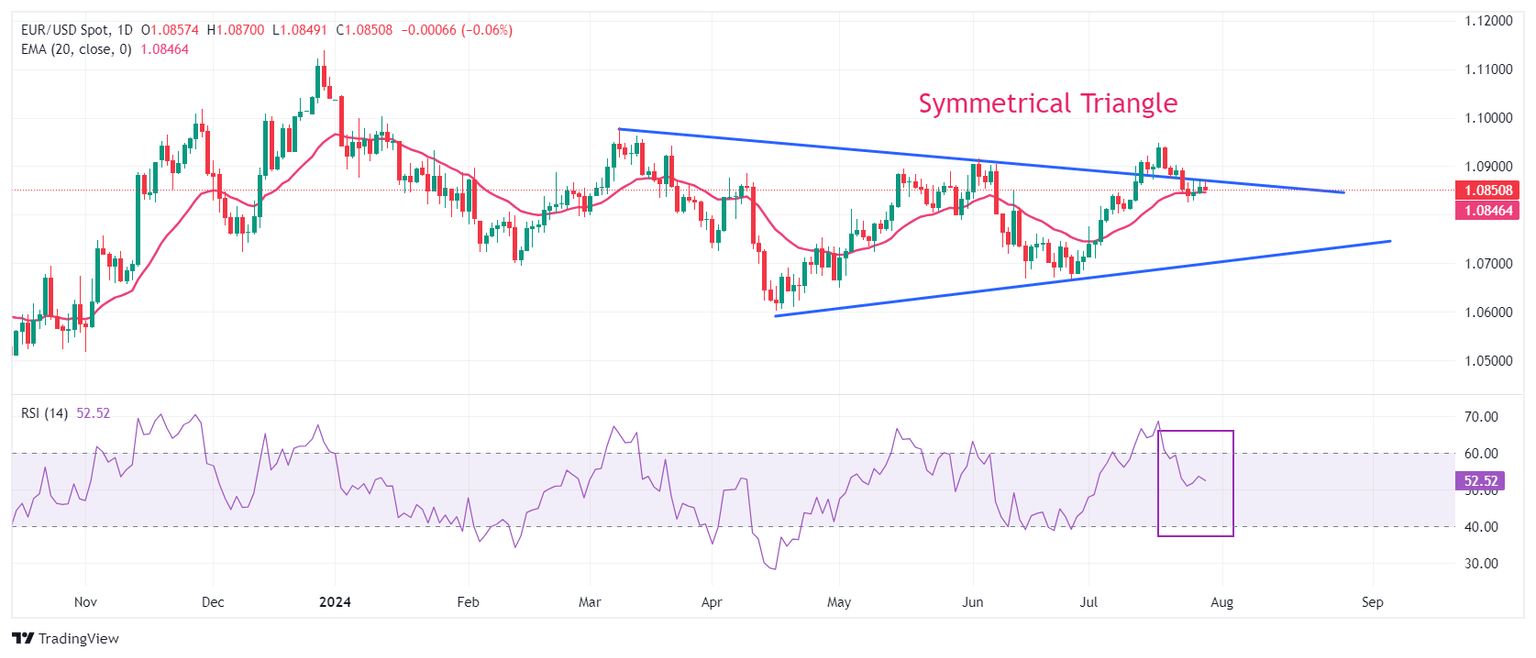 El EUR/USD cae cerca de 1.0800. El par de divisas compartido permanece dentro de una formación de Triángulo Simétrico en un marco de tiempo diario después de no poder mantener la ruptura. El par de divisas principal extiende su caída por debajo de la media móvil exponencial (EMA) de 20 días, que se negocia alrededor de 1.0840. El par de divisas compartido podría deslizarse aún más hacia los soportes de nivel redondo cerca de 1.0800 y 1.0700.