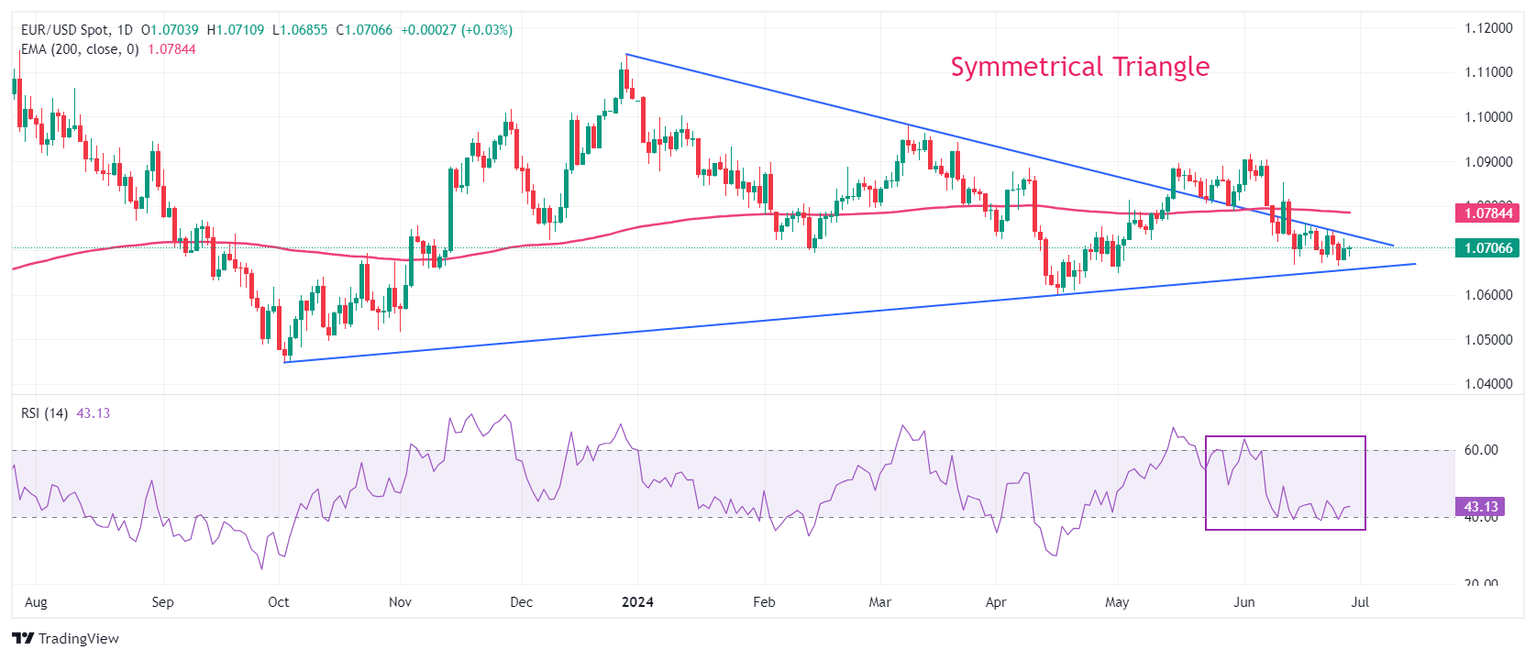- El EUR/USD se mantiene cerca de 1.0700 mientras el Dólar estadounidense corrige. Las perspectivas del Euro parecen inciertas antes del resultado de las elecciones francesas y los datos preliminares del Índice Armonizado de Precios al Consumo (HICP) de la Eurozona para junio, que se publicarán el martes.