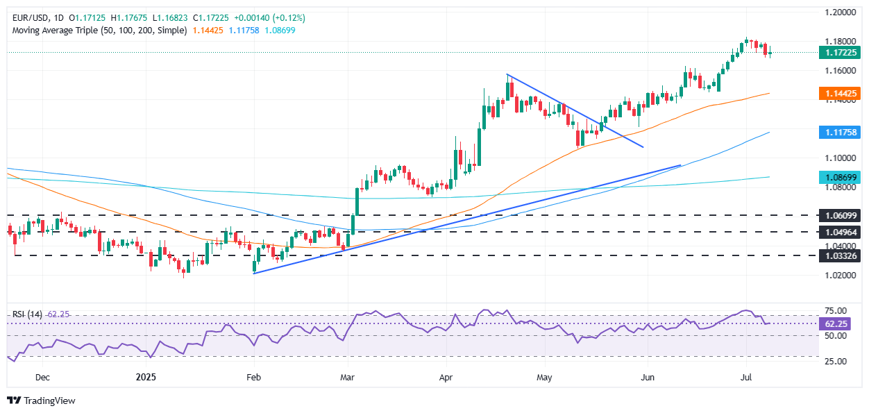 El EUR/USD registra ganancias mínimas durante la sesión norteamericana a medida que el dólar estadounidense borra algunas de sus ganancias anteriores, tras la demanda del presidente de EE.UU., Donald Trump, de que la Reserva Federal recorte las tasas de interés, mientras retrasa la fecha límite del 9 de julio hacia el 1 de agosto. En el momento de escribir, el par se negocia a 1.1724, con un aumento del 0.14%.