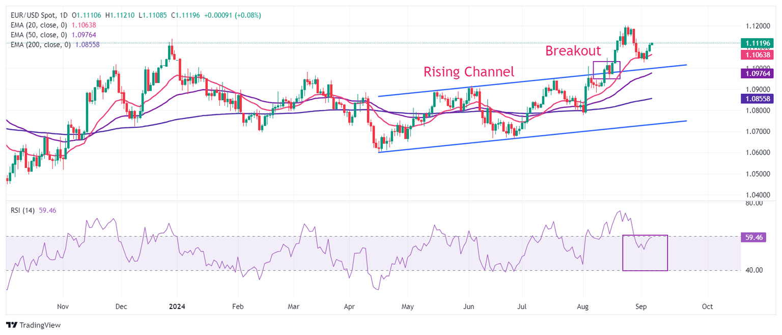 El EUR/USD no logra mantener las ganancias por encima de la cifra redonda de 1.1100. Sin embargo, la perspectiva a corto plazo del par de divisas principal sigue siendo firme ya que logra afianzarse cerca de la media móvil exponencial (EMA) de 20 días alrededor de 1.1055.