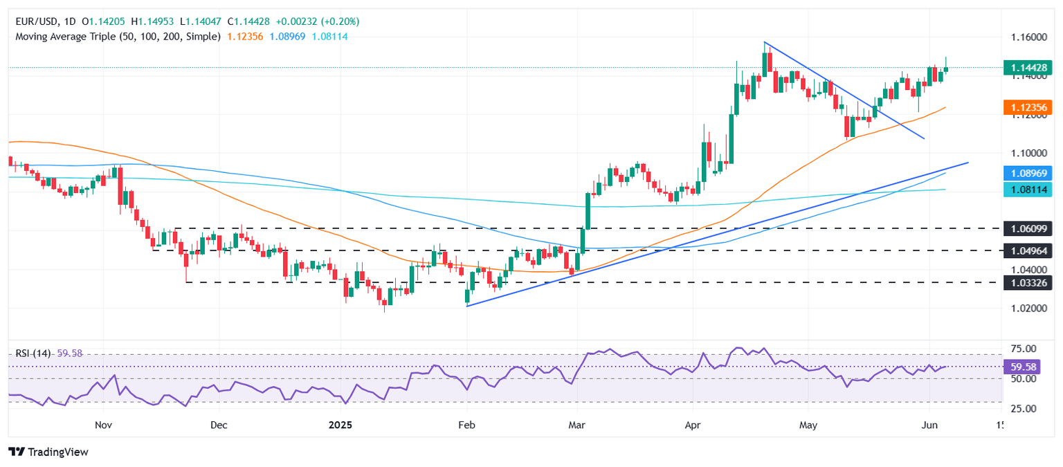El EUR/USD mantiene ganancias anteriores de más del 0.20% después de que el Banco Central Europeo (BCE) acaparara los titulares, reduciendo las tasas pero dejando la puerta abierta para una pausa en la próxima reunión del 24 de julio. Al momento de escribir, el par se negocia a 1.1441 después de rebotar desde mínimos diarios de 1.1404.