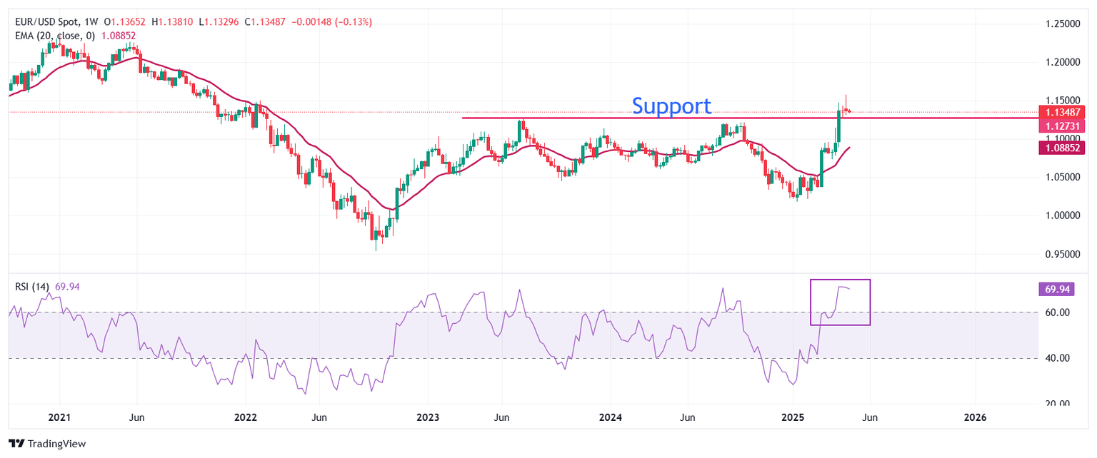 El EUR/USD oscila alrededor de 1.1350 en la sesión europea del lunes. La perspectiva del par de divisas principal sigue siendo alcista ya que la media móvil exponencial (EMA) de 20 semanas se inclina al alza alrededor de 1.0885.