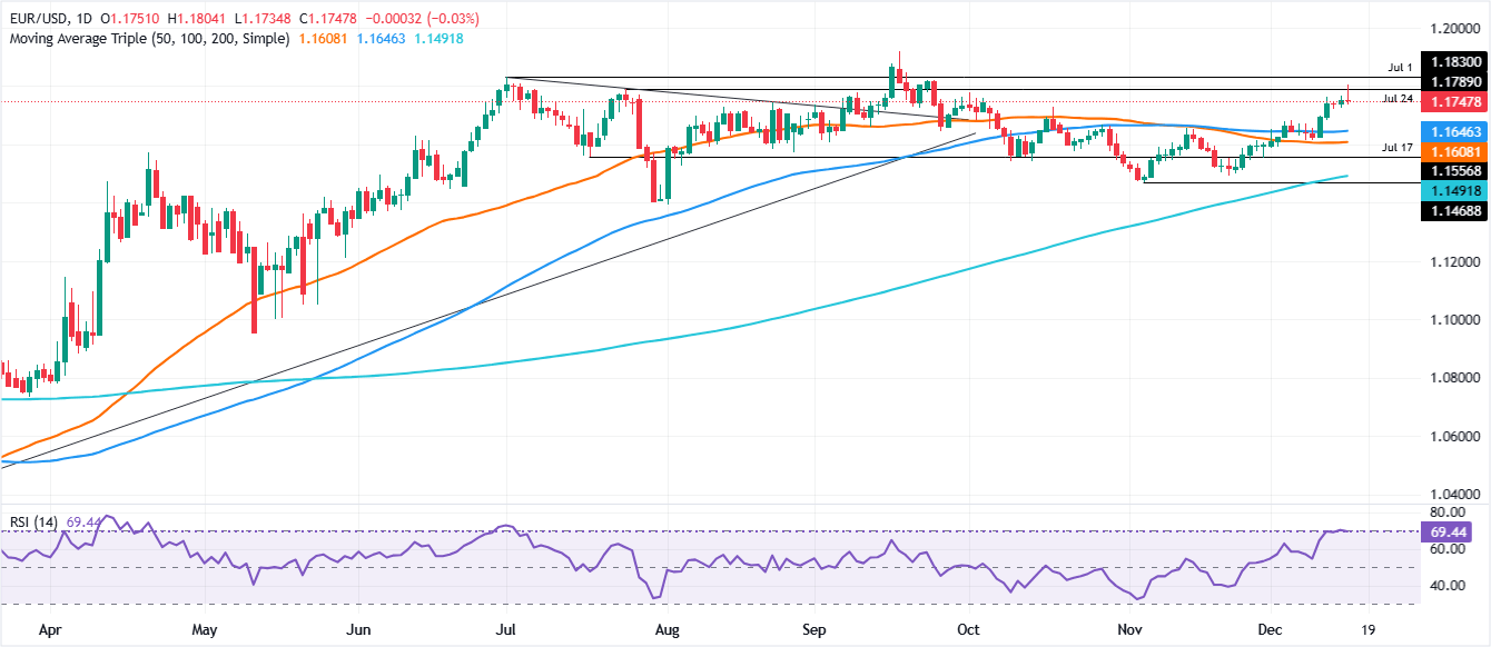El EUR/USD se mantiene firme en torno a 1.1750, prácticamente sin cambios tras el último informe de empleo de EE.UU. que reforzó las posibilidades de que la Reserva Federal (Fed) pudiera continuar su ciclo de alivio el próximo año. Al momento de escribir, el par registró pérdidas mínimas del 0.04%.