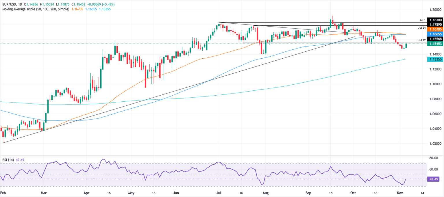 - EUR/USD sube un 0.45% a 1.1545 tras rebotar desde mínimos diarios cerca de 1.1486 en medio de una debilidad general del USD.