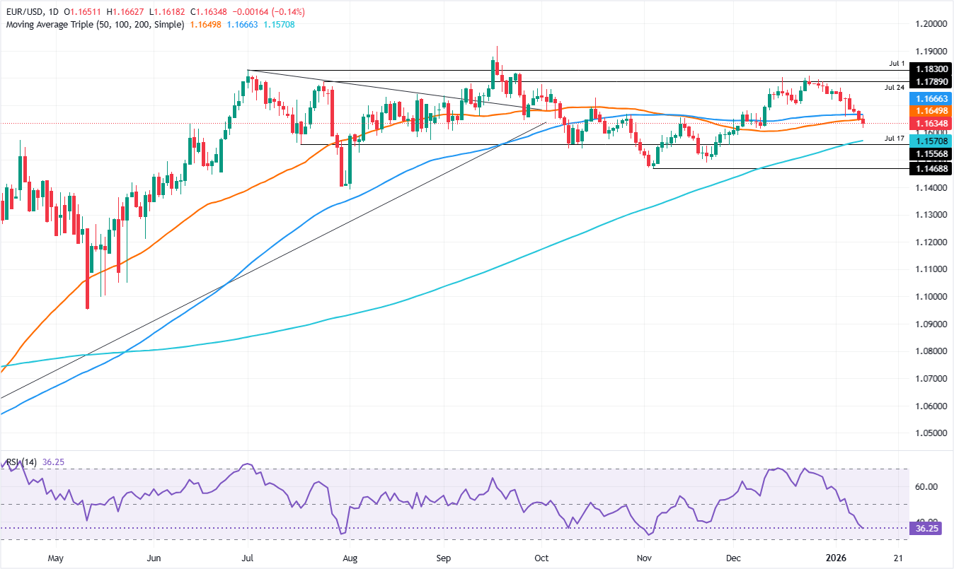 La imagen técnica muestra que el EUR/USD tiene un sesgo neutral a bajista, ya que el impulso bajista se intensificó, debido a la caída del par, que despejó niveles de soporte clave como las medias móviles simples (SMA) de 100 y 50 días, cada una en 1.1663 y 1.1641, respectivamente.