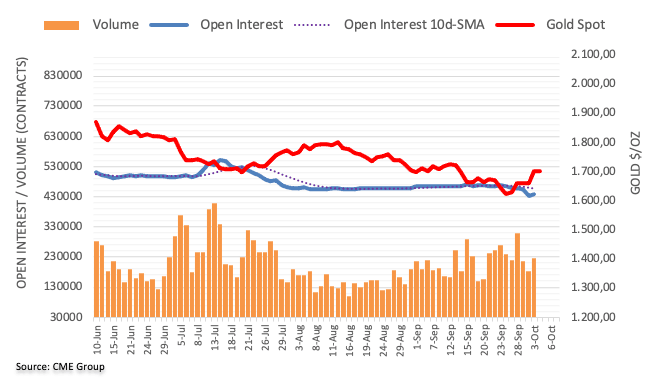 Los precios del oro ampliaron el rebote y coquetearon con la barrera clave de los 1.700 dólares a principios de la semana. El repunte se produjo gracias al aumento del interés abierto y del volumen y deja la puerta abierta a ganancias adicionales a muy corto plazo y con el objetivo inmediato ahora en el máximo de septiembre en 1.735$ (12 de septiembre).