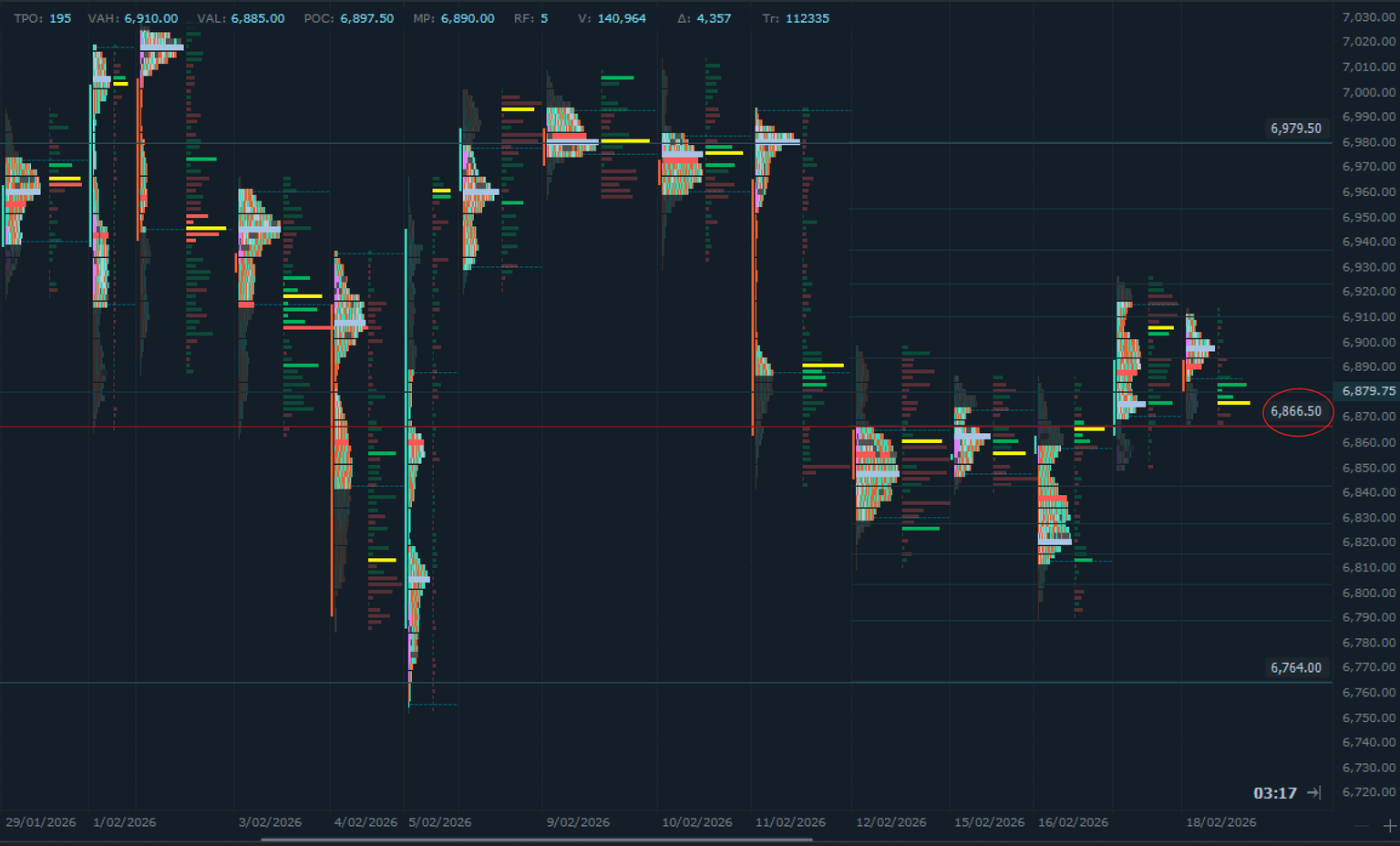 Las operaciones de ayer (18 de febrero) empujaron hacia la puerta superior (6893–6909) pero no lograron encontrar aceptación por encima de la estructura. El impulso se desvaneció y el precio rotó de nuevo hacia el CP diario (6866) — manteniendo al mercado en modo de "niveles primero" en lugar de en modo de tendencia direccional.