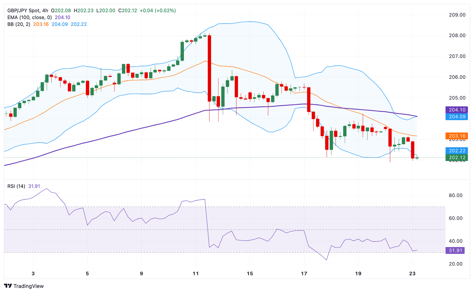 El cruce GBP/JPY permanece bajo cierta presión vendedora alrededor de 202.20 el martes durante la sesión temprana europea. El entorno de aversión al riesgo y la creciente especulación de que el Banco de Japón (BoJ) subirá las tasas la próxima semana apoyan al Yen Japonés (JPY) y crean un viento en contra para el GBP/JPY.