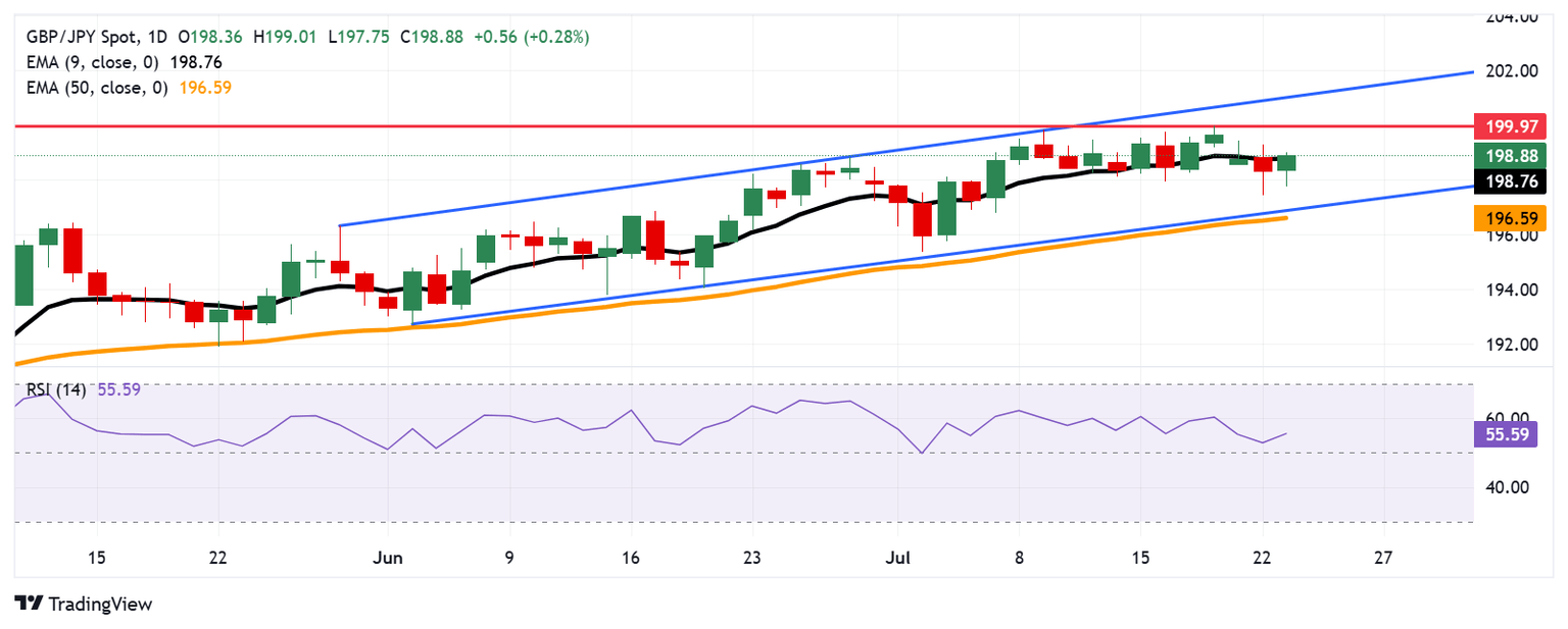 El GBP/JPY ha recuperado sus pérdidas recientes, cotizando alrededor de 198.80 durante las horas asiáticas del miércoles. Una mirada al gráfico diario sugiere que el cruce de divisas se está moviendo hacia arriba dentro de un patrón de canal ascendente, sugiriendo un sesgo alcista persistente.