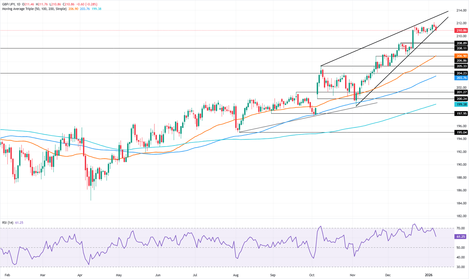La imagen técnica del GBP/JPY sigue siendo constructiva, pero un cambio repentino en el impulso, como lo indica el Índice de Fuerza Relativa (RSI), sugiere que un retroceso está en camino.