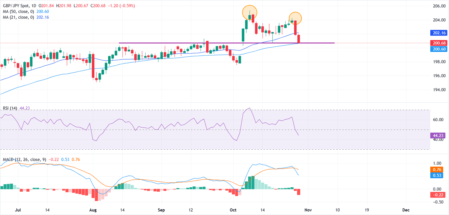 - Una ruptura decisiva por debajo de 200.00 podría abrir el camino hacia 198.87, llenando el hueco alcista de principios de octubre.