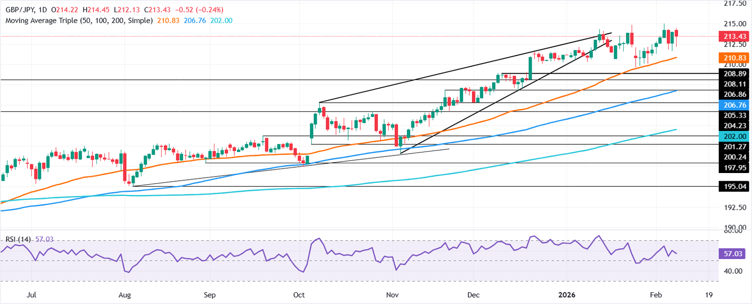 Si el GBP/JPY cae por debajo de 213.00, el soporte inmediato sería la media móvil simple (SMA) de 20 días en 212.57. Una vez superada, la siguiente parada sería la SMA de 50 días en 210.80.