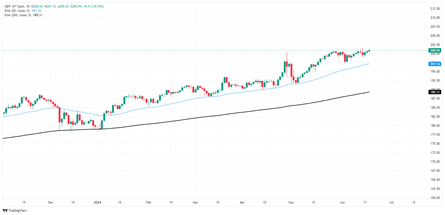 El GBP/JPY se mantiene firmemente en la parte alta, cotizando en el nivel de 201.00 en una acción del miércoles con poco volumen y manteniéndose cerca de los máximos de 16 años cerca de 201.60. El cruce alcanzó nuevos máximos la semana pasada y continúa cerca del extremo superior a pesar de un retroceso a corto plazo por debajo de 199.00.