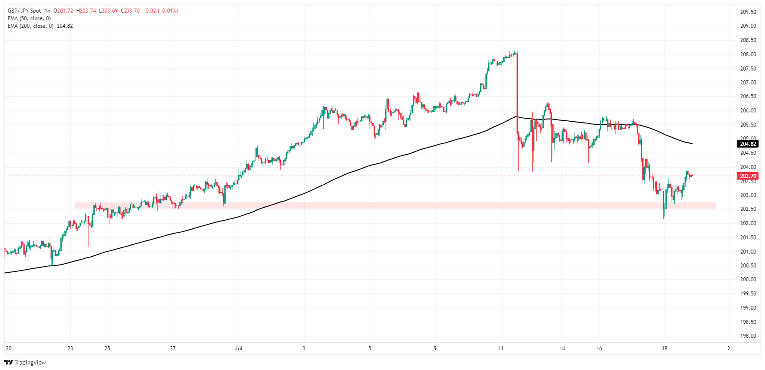 El Guppy alcanzó una zona de demanda cerca de 202.50 temprano el jueves, capturando un rebote hacia 204.00 mientras los postores encuentran su base y empujan las ofertas de GBP/JPY a un modo de recuperación. La acción del precio intradía todavía se negocia al sur de la media móvil exponencial (EMA) de 200 horas en 204.82, y 202.50 ha sido marcada como una línea en la arena para la presión corta continua.