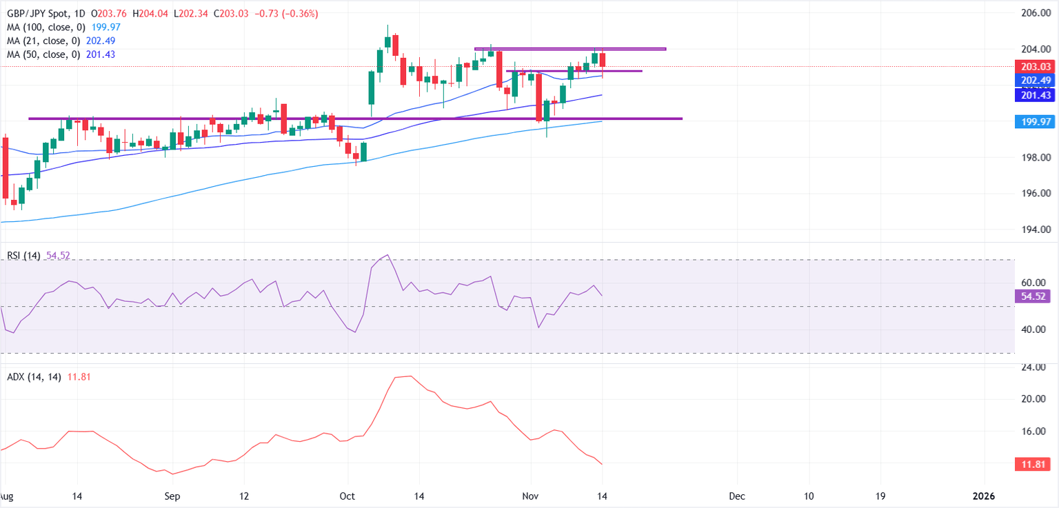 En el momento de escribir, el GBP/JPY se cotiza alrededor de 203.00, bajando casi un 0.30%, tras rebotar desde un mínimo intradía de 202.34.