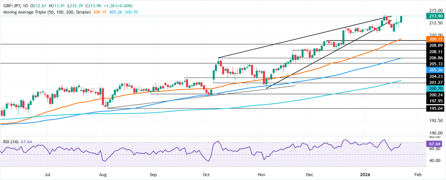 La imagen técnica muestra que el GBP/JPY sigue con sesgo alcista, aunque después de alcanzar un pico anual de 214.29 el 13 de enero retrocedió hacia la marca de 211.00. Desde entonces, el par se ha consolidado dentro del área de 211.00 – 213.00, antes de que los compradores despejaran la parte superior del rango intentando desafiar el máximo anual actual.