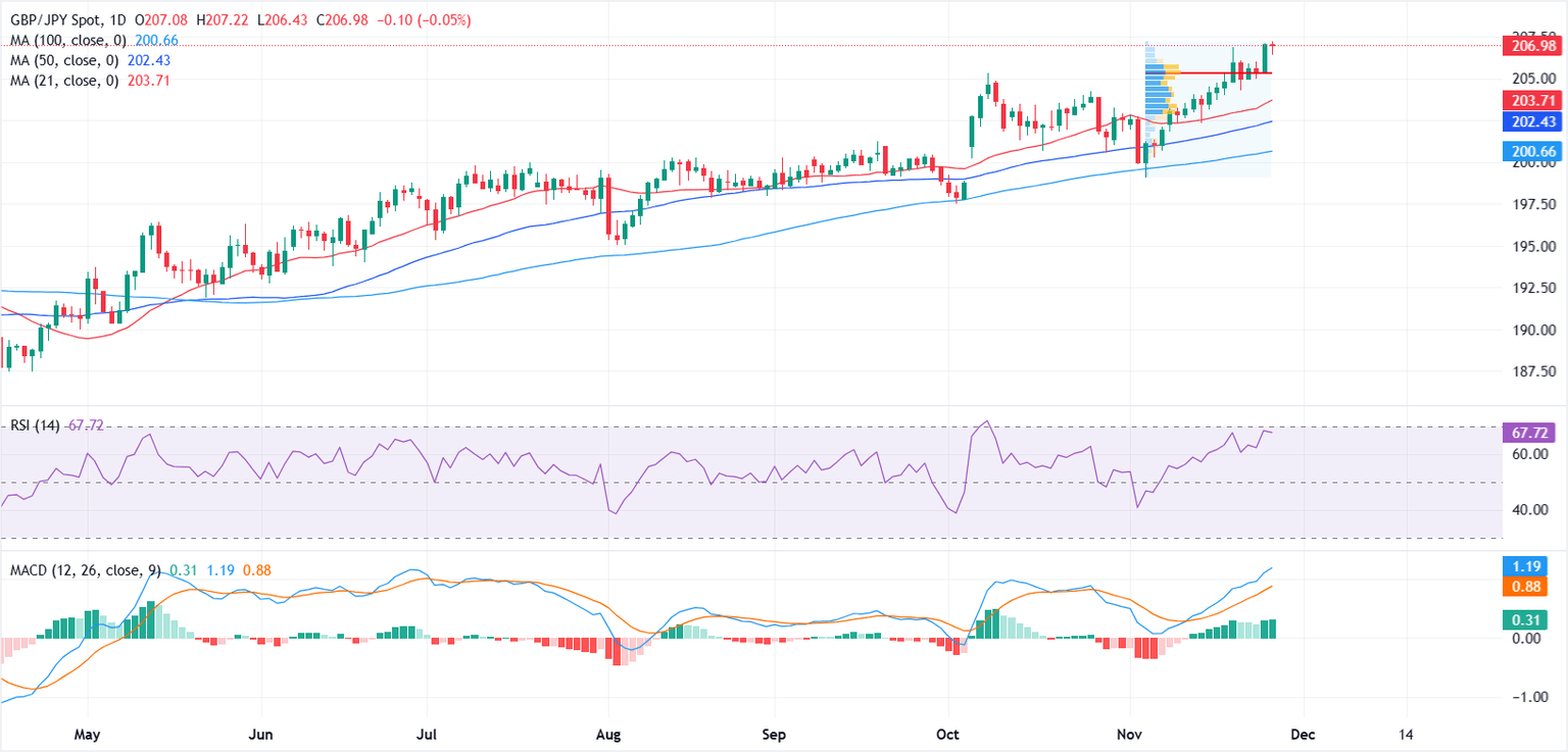 El GBP/JPY se mantiene estable cerca de 207.00 el jueves tras tocar un nuevo máximo del año el día anterior, con el sentimiento inclinándose a favor de la Libra esterlina (GBP) tras el Presupuesto de Otoño del Reino Unido.