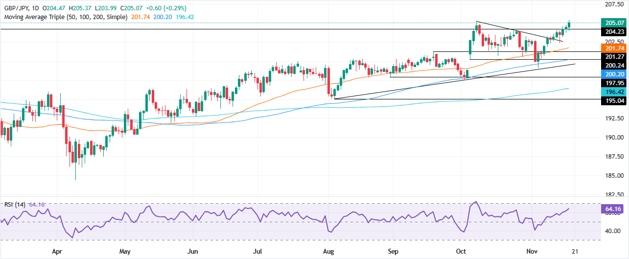 El GBP/JPY retrocede algo después de alcanzar 205.37, renovando máximos anuales, aunque se mantiene el impulso alcista. El par ha registrado sucesivos máximos y mínimos más altos, indicando que el impulso favorece a los compradores. Además, el Índice de Fuerza Relativa (RSI) apunta al alza en territorio alcista, otra señal que refuerza las posibilidades de los alcistas para precios más altos.