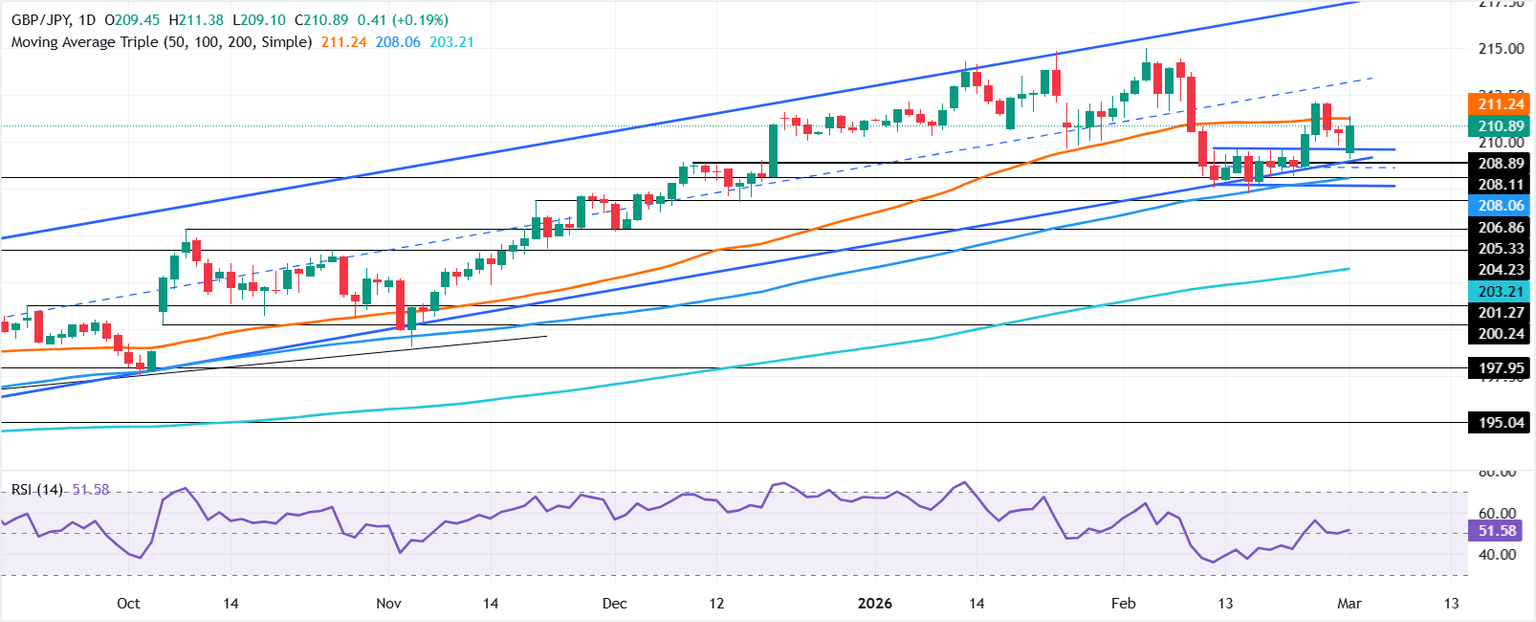 El GBP/JPY sube durante la sesión norteamericana del lunes, avanzando un 0.24% tras recuperarse de los mínimos diarios de 209.10 en medio de la aversión al riesgo provocada por el conflicto en Oriente Medio entre EE.UU. e Irán. En el momento de escribir, el par cotiza en 210.98, a punto de superar la barrera de 211.00.