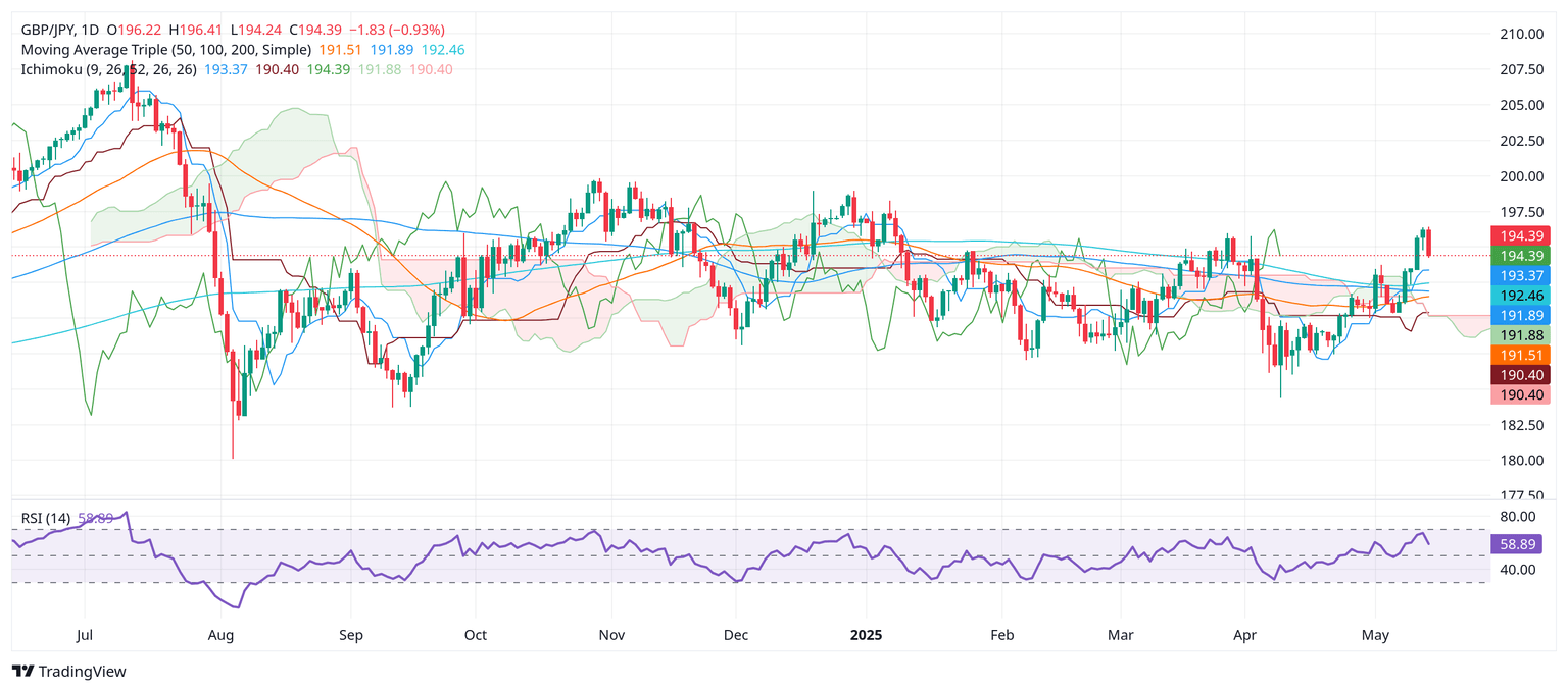 - Una ruptura por debajo de 194.22 podría abrir el camino hacia 193.31 Tenkan-sen y la SMA de 200 días en 192.32.