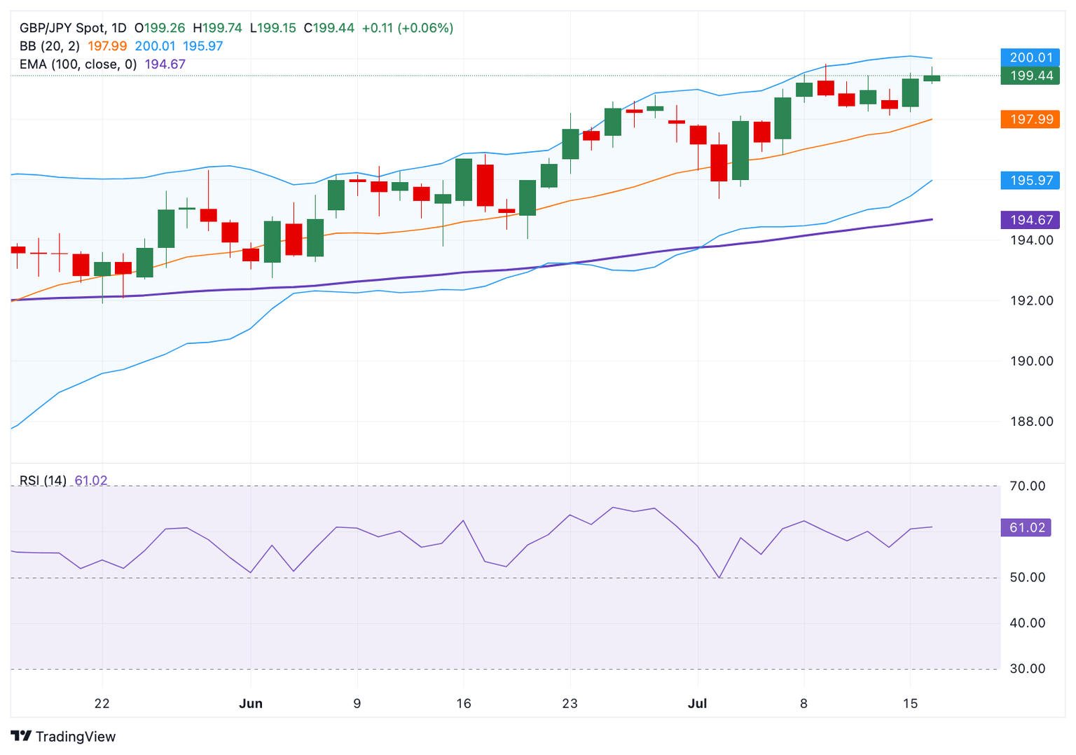 El cruce GBP/JPY cotiza con ligeras ganancias alrededor de 199.45 durante la primera parte de la sesión europea del miércoles. El informe de inflación del IPC del Reino Unido de junio, más alto de lo esperado, proporciona algo de soporte a la Libra esterlina (GBP) frente al Yen japonés (JPY). La atención se centrará en los datos de empleo del Reino Unido, que se publicarán el jueves.
